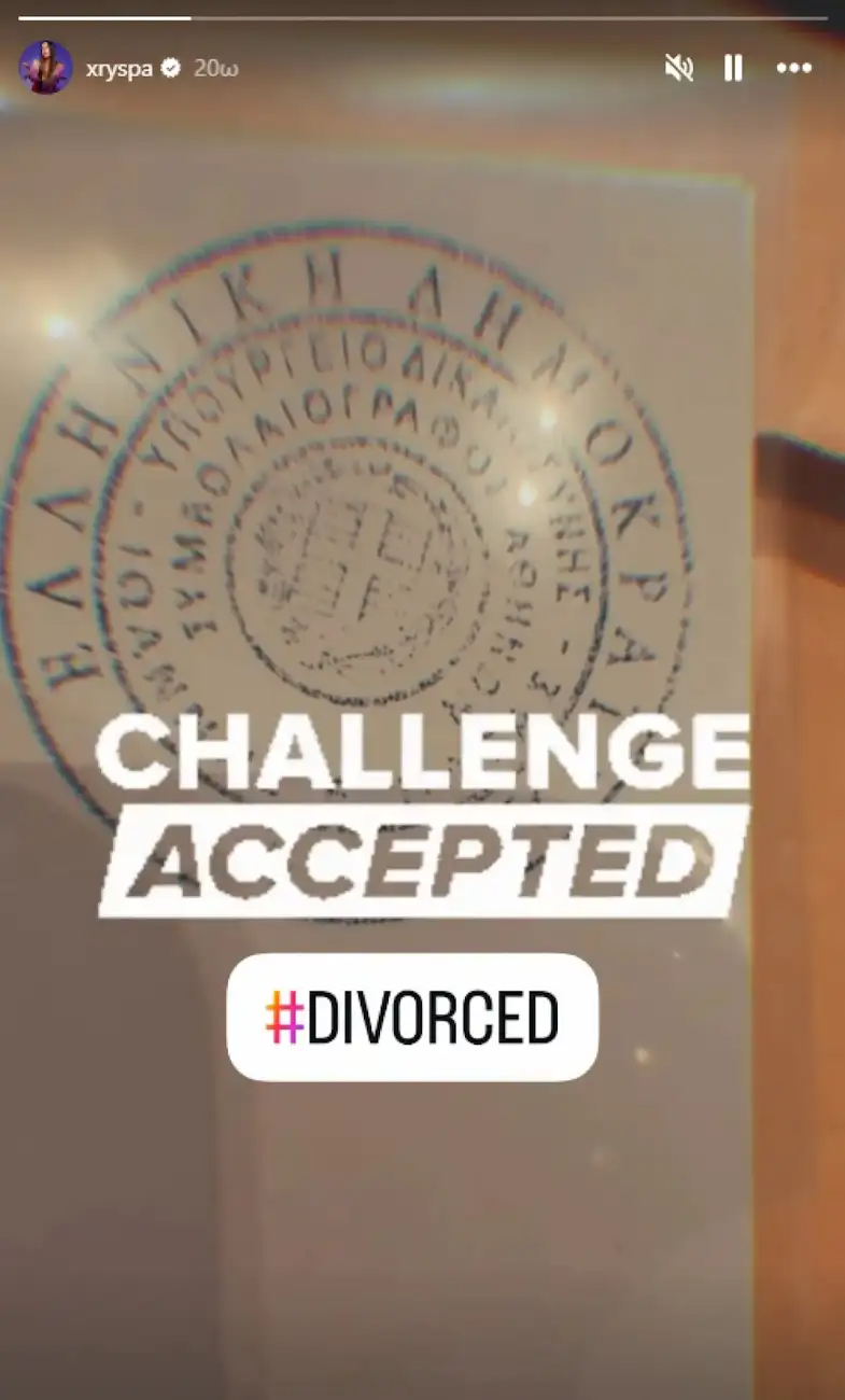 Η Χρύσπα έκανε και σχετική ανάρτηση στον προσωπικό της λογαριασμό στο Instagram. Δημοσίευσε μία φωτογραφία από τα χαρτιά του διαζυγίου και έγραψε πάνω σε αυτή: «Challenge accepted #Divorced».