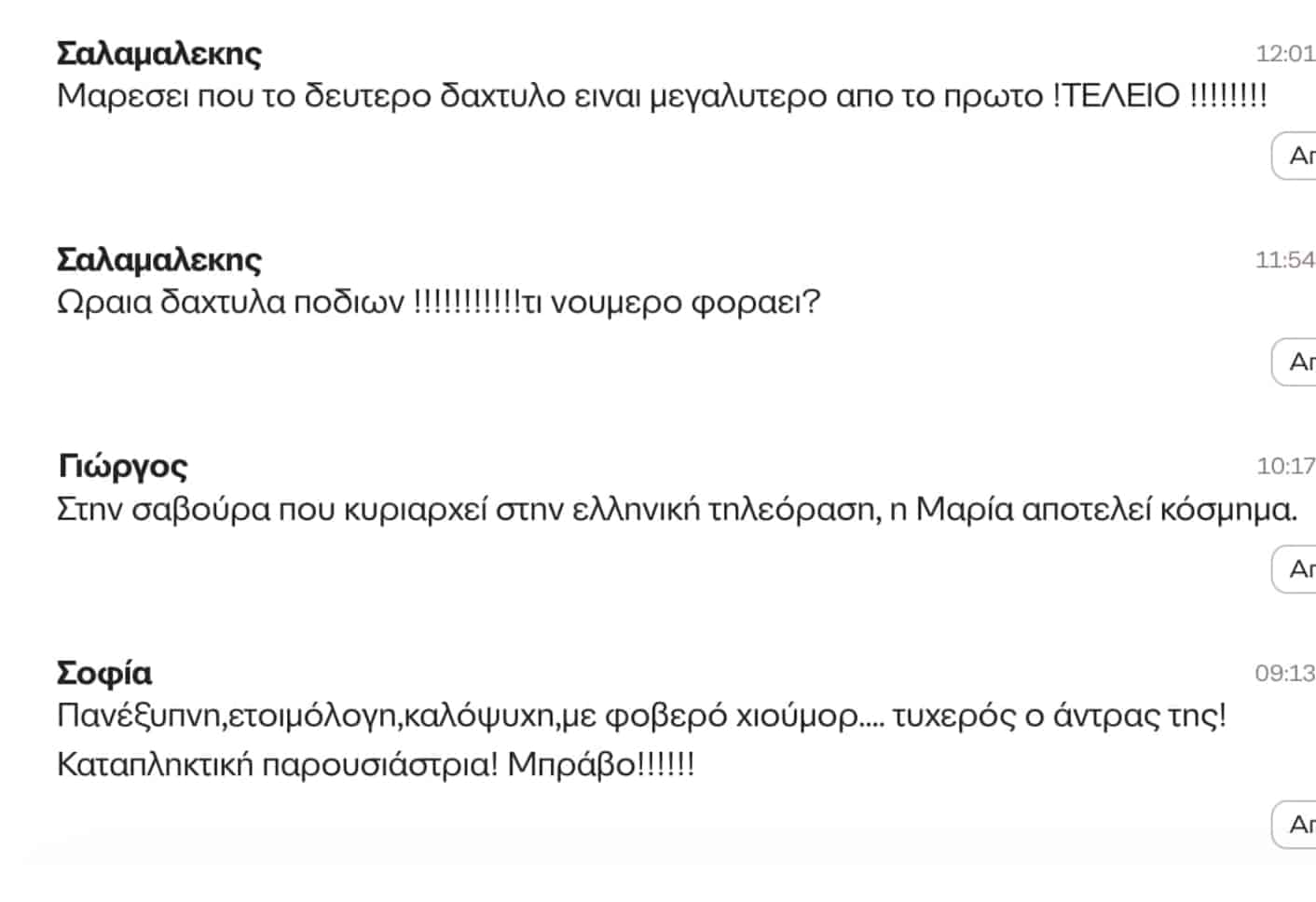 «Έχω μάθει λοιπόν να μην σκάω. Αγαπάω τη δουλειά μου και νιώθω πολύ τυχερή που κάνω αυτό που αγαπάω και από αυτό κερδίζω χρήματα για να ζήσω που είναι πολύ σημαντικό. Όλα όμως είναι απλά. Δεν με αγγίζουν οι τοξικότητες, δεν ασχολούμαι. Τα θεωρώ πολύ χάσιμο χρόνου όλα αυτά» είχε πει σε συνέντευξή της, στα τέλη του φετινού Μαρτίου.