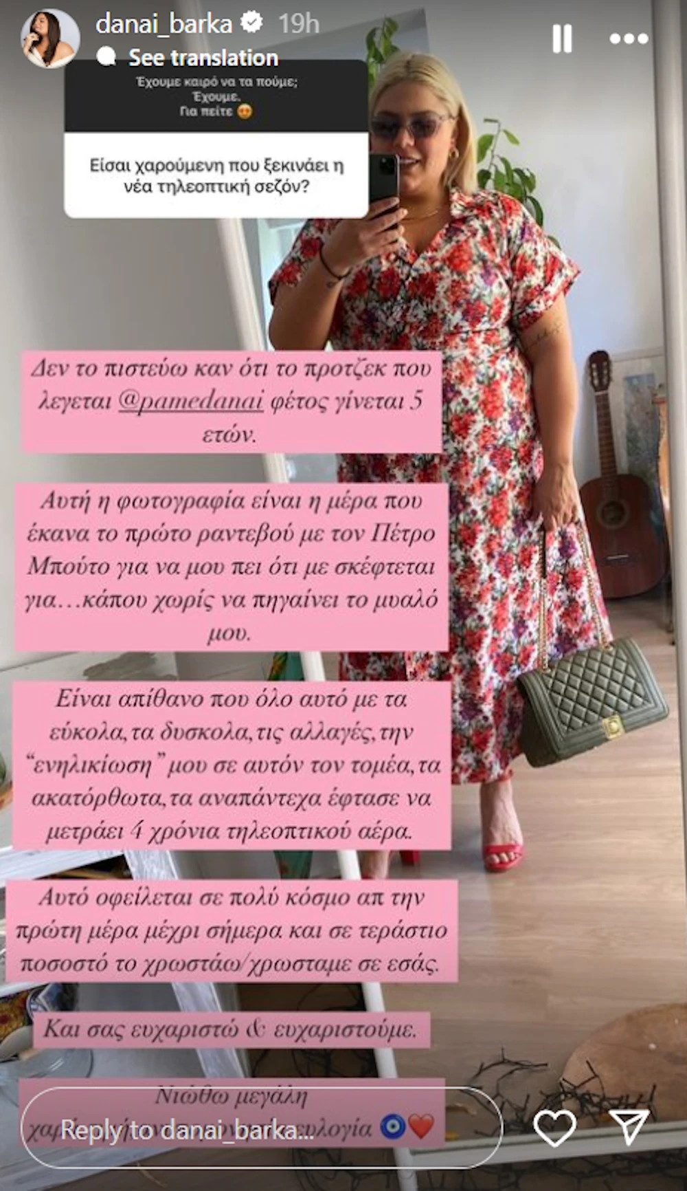 «Δεν το πιστεύω καν ότι το project που λέγεται “Πάμε Δανάη” φέτος γίνεται πέντε ετών. Αυτή η φωτογραφία είναι η μέρα που έκανα το πρώτο ραντεβού με τον Πέτρο Μπούτο για να μου πει ότι με σκέφτεται για… κάπου χωρίς να πηγαίνει το μυαλό μου. Είναι απίθανο που όλο αυτό με τα εύκολα, τα δύσκολα, τις αλλαγές, την ενηλικίωση μου σε αυτόν τον τομέα, τα ακατόρθωτα, τα αναπάντεχα, έφτασε να μετράει τέσσερα χρόνια τηλεοπτικό αέρα. Αυτό οφείλεται σε πολύ κόσμο απ’ την πρώτη μέρα μέχρι και σήμερα και σε τεράστιο ποσοστό του χρωστάω/χρωστάμε σε σας. Σας ευχαριστώ και ευχαριστούμε. Νιώθω μεγάλη χαρά, τιμή, ανυπομονησία, ευλογία».
