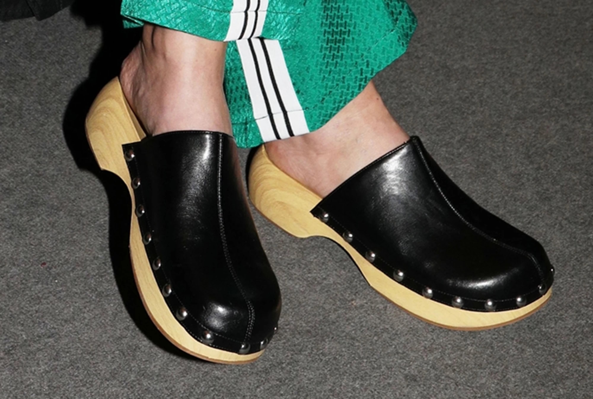 Την εμφανισή της ολοκλήρωσε με τα άνετα και μοδάτα σαμπό της, τα οποία είναι μαύρα δερμάτινα με ξύλινη σόλα.