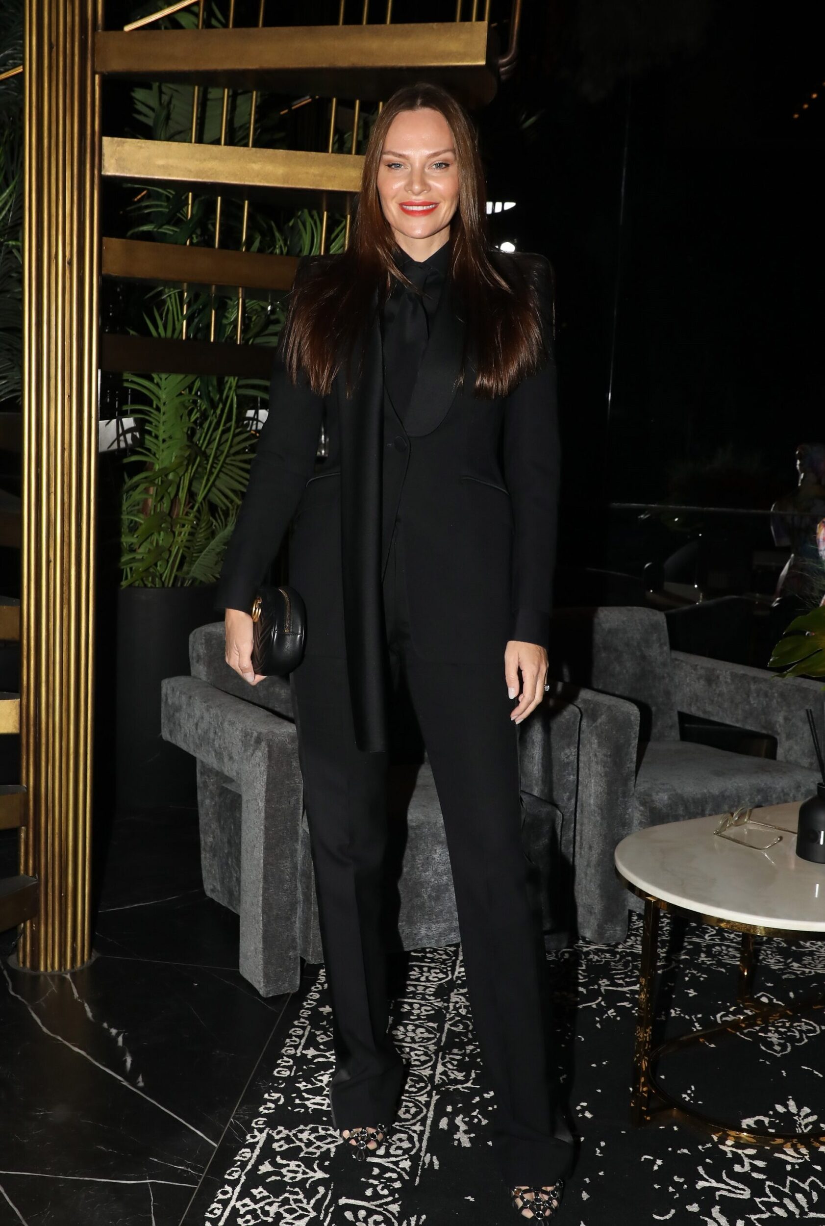Η σχεδιάστρια μόδας φωτογραφήθηκε χαμογελαστή μέσα στο μαύρο σύνολό της, το οποίο συνδύασε με μαύρο, δερμάτινο τσαντάκι, ίσια μαλλιά και κόκκινο κραγιόν. Το outfit της ξεχώριζε για το μακρύ παντελόνι του και το μαύρο πουκάμισο με τον κλειστό γιακά και τη γραβάτα. Το σακάκι της ήταν μεσάτο και τόνιζε τη λεπτή μέση της, ενώ οι γόβες της διακρίνονταν για τη λάμψη και το περίτεχνο σχέδιό τους, που άφηνε ακάλυπτο το δέρμα.