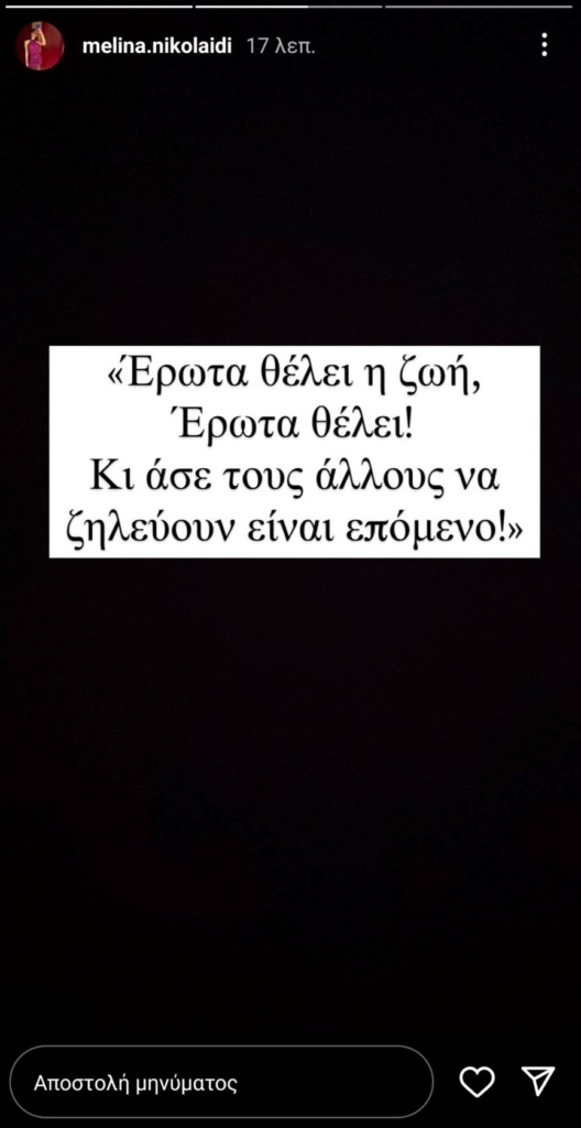 «Έρωτα θέλει η ζωή, έρωτα θέλει! Κι άσε τους άλλους να ζηλεύουν είναι επόμενο» έγραψε η 19χρονη Μελίνα, χρησιμοποιώντας ουσιαστικά στην απάντησή της τους στίχους από το κομμάτι της μητέρας της «Έρωτα θέλει η ζωή» που κυκλοφόρησε το 2010.