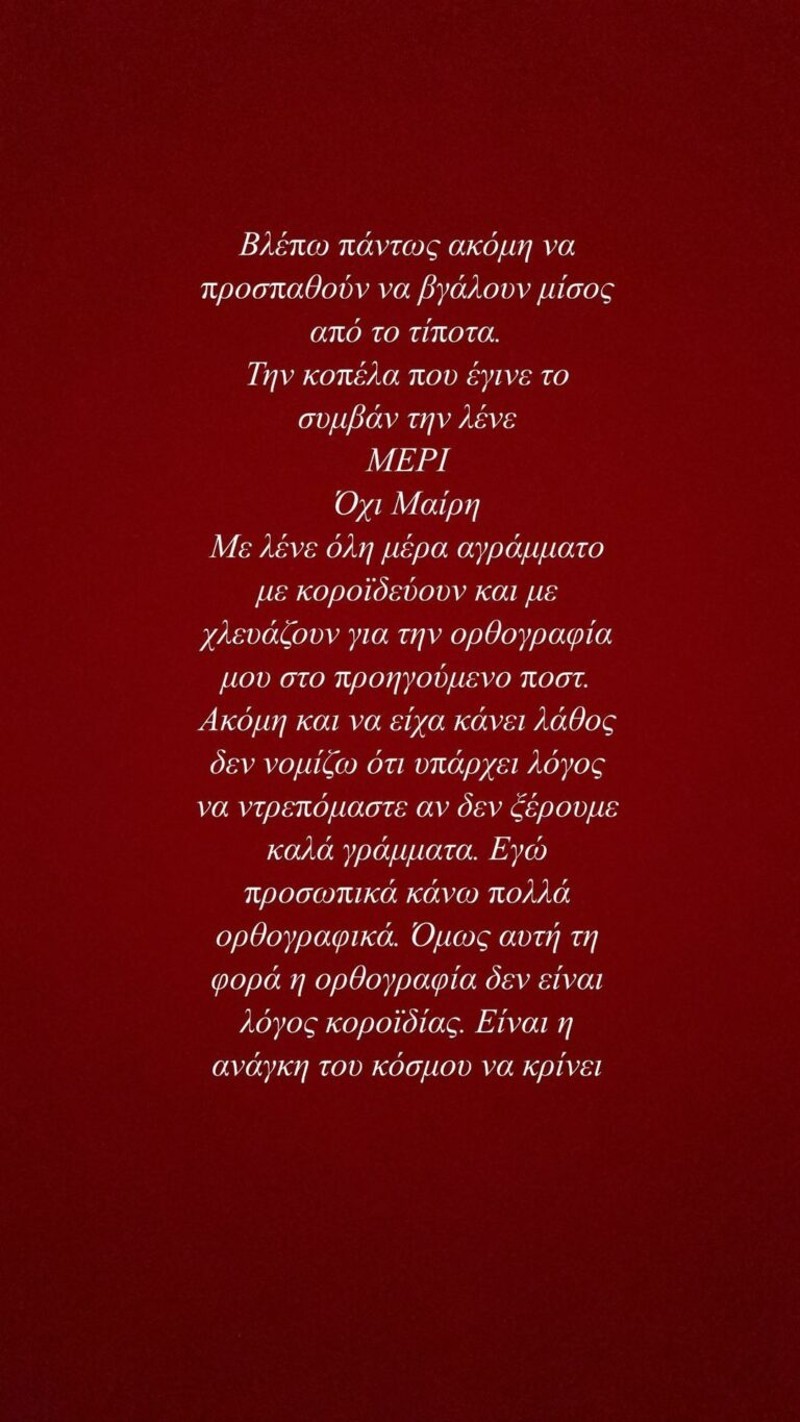 «Βλέπω πάντως ακόμη να προσπαθούν να βγάλουν μίσος από το τίποτα. Την κοπέλα που λένε το συμβάν την λένε ΜΕΡΙ. Όχι Μαίρη. Με λένε όλη μέρα αγράμματο, με κοροϊδεύουν και με χλευάζουν για την ορθογραφία μου στο προηγούμενο ποστ. Ακόμη και να είχα κάνει λάθος δεν νομίζω ότι υπάρχει λόγος να ντρεπόμαστε αν δεν ξέρουμε καλά γράμματα. Εγώ προσωπικά κάνω πολλά ορθογραφικά. Όμως αυτή τη φορά η ορθογραφία δεν είναι λόγος κοροϊδίας. Είναι η ανάγκη του κόσμου να κρίνει», έγραψε ο Τάσος Ξιαρχό στα Stories του.