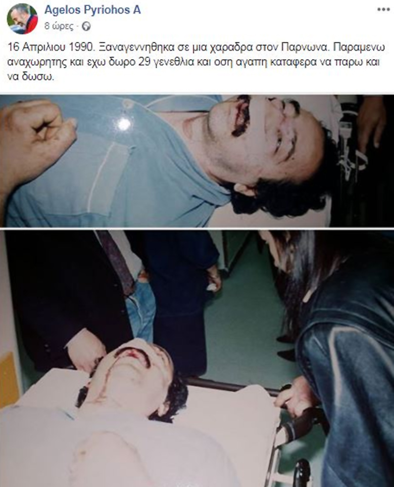 Ο Άγγελος Πυριόχος το 1990 είχε ένα τραγικό ατύχημα που παραλίγο να του κοστίσει τη ζωή.Ο ίδιος είχε αναφέρει το 1999: «Ξαναγεννήθηκα σε μια χαράδρα στον Πάρνωνα. Παραμένω αναχωρητής και έχω δώρο 29 γενέθλια και όση αγάπη κατάφερα να πάρω και να δώσω.Ένα τετραθέσιο αεροπλάνο επιστρέφει από Σπάρτη, ο κασκαντέρ πιλότος δεν δέχεται τις συμβουλές των πιλότων της αερολέσχης να βγει Μονεμβάσια για να αποφύγει την κακοκαιρία ,προσπαθεί να ανεβάσει το αεροσκάφος πάνω από τον Πάρνωνα και λίγο πριν φτάσει στην κορυφή του και αφού έχει χάσει το ένα φτερό από σύγκρουση σε χαράδρα, πέφτει. Μέσα είμαστε 4 άτομα.