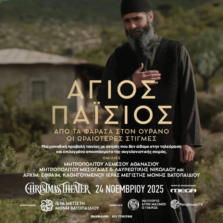 Η Ιερά Μεγίστη Μονή Βατοπαιδίου παρουσιάζει μία ξεχωριστή βραδιά αφιερωμένη στον Άγιο Παΐσιο, μέσα από την προβολή ταινίας με σκηνές που δεν είδαμε στην τηλεόραση και τα ωραιότερα αποσπάσματα της τηλεοπτικής σειράς «Άγιος Παΐσιος – Από τα Φάρασα στον Ουρανό», η οποία άγγιξε βαθιά τις καρδιές εκατομμυρίων ανθρώπων και προκάλεσε συγκίνηση σε όλη την Ελλάδα.