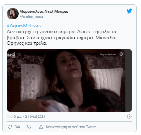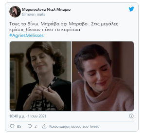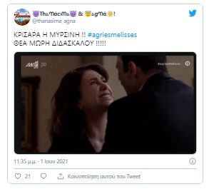 Τώρα έχει, όμως, και η οργή της είναι μεγάλη. Δεν θέλει να τις αφήσει να γλιτώσουν, θέλει να τις εξαφανίσει. Το πρόσωπό της αγρίεψε, η όψη της έγινε τρομακτική και το βλέμμα της “σκοτώνει”. Μια άλλη Μυρσίνη εμφανίστηκε στο επεισόδιο της Δευτέρας, ενώ πάνω της χτίστηκαν σχεδόν όλες οι σκηνές.