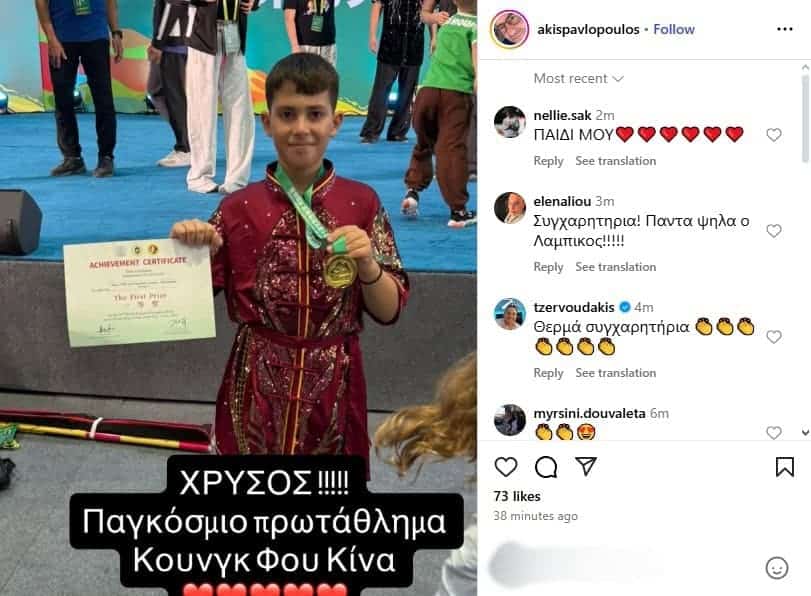 Ο γνωστός παρουσιαστής δεν μπόρεσε να κρύψει τη χαρά και τη συγκίνησή του όταν μίλησε για τη σπουδαία διάκριση του 11χρονου γιου του, Λάμπη Παυλόπουλου, ο οποίος κατάφερε να κατακτήσει το χρυσό μετάλλιο στο Παγκόσμιο Πρωτάθλημα Κουνγκ Φου που πραγματοποιήθηκε στην Κίνα.