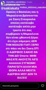 «Μη μασάτε ρε κόλπα της παραγωγής να ανεβάσει λίγο τηλεθέαση. Βρίσκονται στο δάσος Μαριαλένα, Σάκης, Βασάλος, Σταυρούλα. Ακούτε λίγο τον πρόεδρο. Πώς τα ξέρω όλα, είμαι ένα βήμα πιο μπροστά από την παραγωγή. Συγγνώμη παραγωγή μου, φιλάκια. Ωραίος ο Βασάλος και η Μαριαλένα βρίσκονται με Σάκη και Σταυρούλα, όποιος κατάλαβε κατάλαβε. Απλά μη τρώτε ό,τι σας σερβίρουν. Η Μαριαλένα δεν είναι χθεσινή, ξέρει ότι έχει κάμερες, δεν τη νοιάζει γιατί ξέρει ότι πάει να δει τον Σάκη, ότι ο αδερφός Σάκης θα τη δει οπότε μη μασάτε!», έγραψε ο Τριαντάφυλλος.