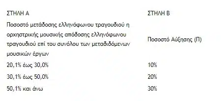 Στους ραδιοφωνικούς σταθμούς, ενημερωτικούς και μη, που περιλαμβάνονται στο μητρώο του Ε.Σ.Ρ. και οι οποίοι εκπέμπουν ξενόγλωσσο μουσικό ρεπερτόριο 95% και άνω, παρέχεται, κατά παρέκκλιση από τις κείμενες διατάξεις, προσαύξηση του επιτρεπόμενου ανώτατου χρόνου μετάδοσης διαφημιστικών μηνυμάτων, εφόσον αυξήσουν τα ποσοστά μετάδοσης ελληνόφωνων τραγουδιών ή ορχηστρικής μουσικής απόδοσης ελληνόφωνων τραγουδιών με βάση την κατωτέρω κλίμακα: