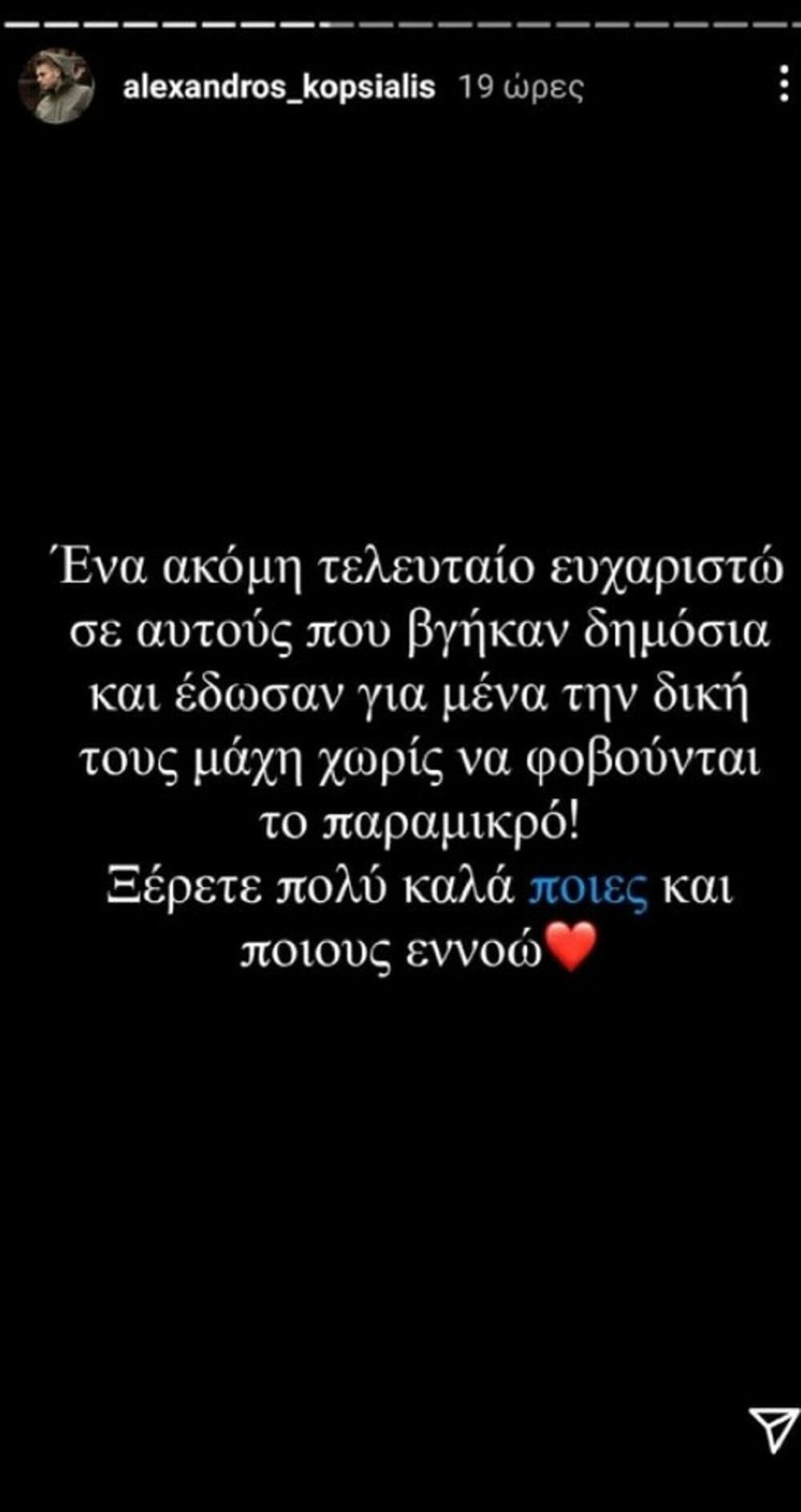 Ο Αλέξανδρος Κοψιάλης ευχαρίστησε τους χρήστες των social media που στέκονται στο πλευρό του ίδιου και της οικογένειάς του, σημειώνοντας «όμως υπήρξαν και εκείνοι οι οποίοι με στήριξαν, από εκεί που δεν το περίμενα, σιωπηλά χωρίς να ψάχνουν cloud και χωρίς να κάνουν θόρυβο. Έπεσε εντελώς τυχαία στην αντίληψή μου και τους βγάζω το καπέλο».