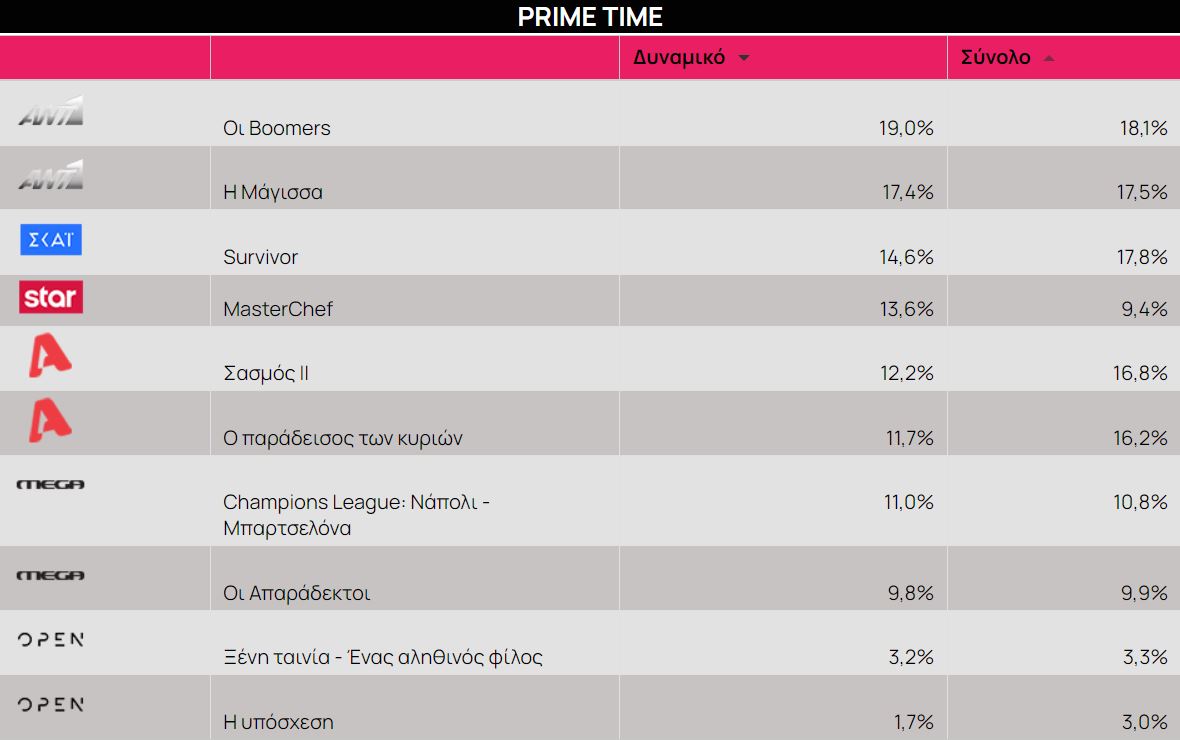 Boomers και Μάγισσα πέρασαν μπροστά ενώ στην τρίτη θέση φιγουράρει το Survivor που πέρασε έστω και οριακά μπροστά από το MasterChef. Το ριάλιτι επιβίωσης ισχυροποιείται στα νούμερα αργά το βράδυ μετά το τέλος του MasterChef οπότε και καταγράφει 20άρια. Στη δεύτερη θέση πάντως στη late night φιγουράρει το Προξενιό της Ιουλίας που καταγράφει πρωτιά στο σύνολο του κοινού.