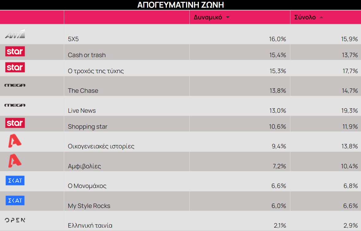 Το δυναμικό κοινό ξεκινά να βλέπει Live News και γυρίζει στα τηλεπαιχνίδια του Star και του ΑΝΤ1.