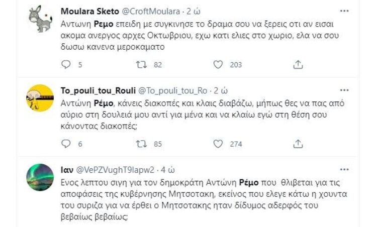 Όσον αφορά στην επίμαχη ατάκα ο Αντώνης Ρέμος είπε: “Οι αναγκαστικές διακοπές είναι όντως αναγκαστικές διακοπές εδώ και ενάμιση χρόνο. Αλλά εδώ και ενάμιση χρόνο δεν έκανα αναγκαστικές διακοπές στη Σαντορίνη. Ήμουν σε ένα άλλο νησί, την Ίο και πήγα στην Σαντορίνη για να πάρω το αεροπλάνο και να γυρίσω στην Αθήνα. Κάποιος κόσμος νομίζει ότι εγώ κάνω ντόλτσε βίτα και δεν με αγγίζει αυτό που συμβαίνει γύρω μου. Είπα ότι κάνω αναγκαστικές διακοπές, δηλαδή είμαι αναγκασμένος να απέχω από την επαγγελματική μου δραστηριότητα, γιατί έτσι όμως είναι τα πράγματα εδώ και ενάμιση χρόνο, όλη η κοινωνία έχει πάθει ζημιά, αλλά ο δικός μας κλάδος, της ψυχαγωγίας, έχει τελειώσει. Δεν υπάρχει τίποτα. Μόλις πάει να ζωντανέψει λίγο, τρώει ξανά τη σφαλιάρα του. Γι’ αυτό είμαι θυμωμένος και στεναχωρημένος, αλλά θα περάσει κι αυτό” συμπλήρωσε ο τραγουδιστής.