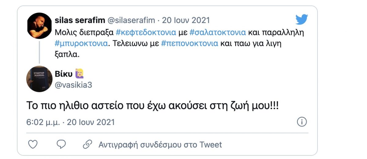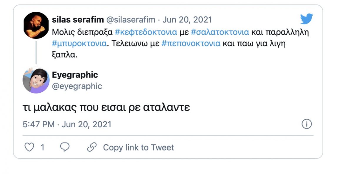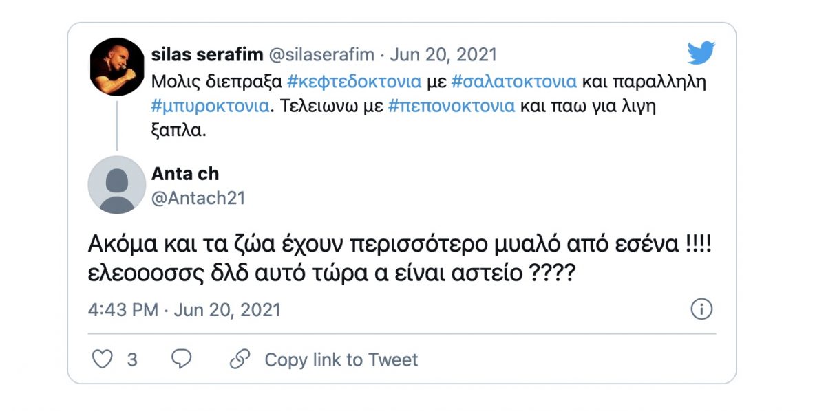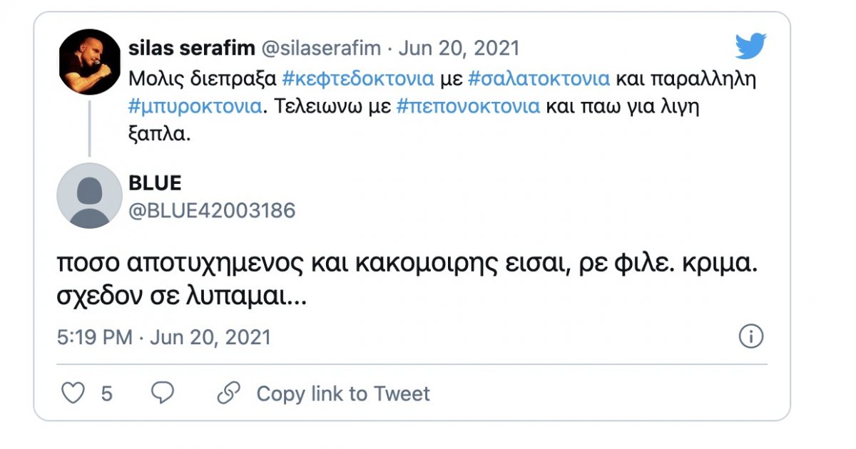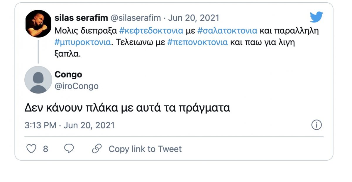 «Μόλις διέπραξα κεφτεδοκτονία με σαλατοκτονία και παράλληλη μπυροκτονία. Τελειώνω με πεπονοκτονία και πάω για λίγη ξάπλα» ήταν το σχόλιο του Σίλα Σεραφείμ.