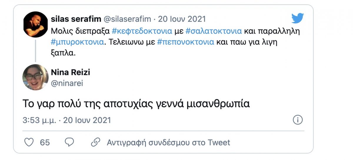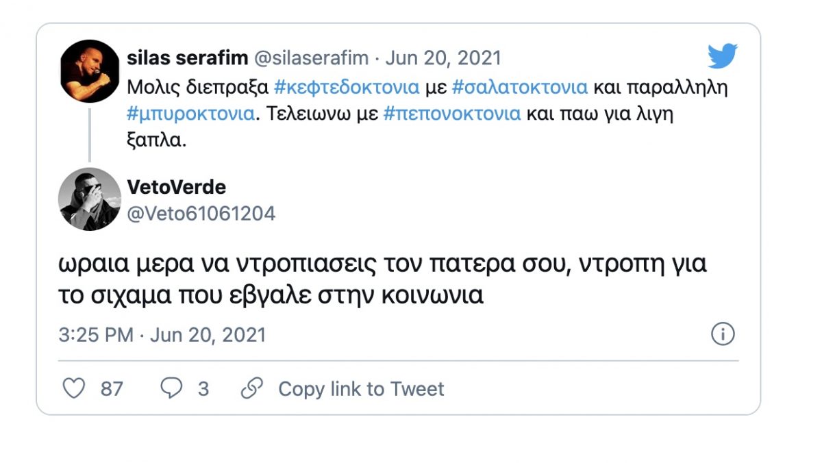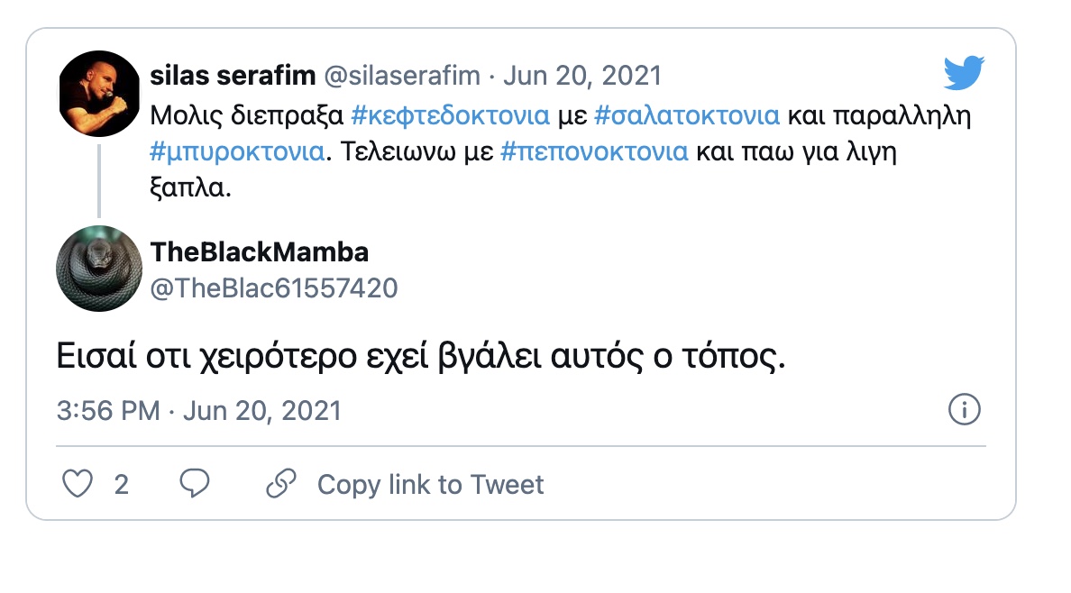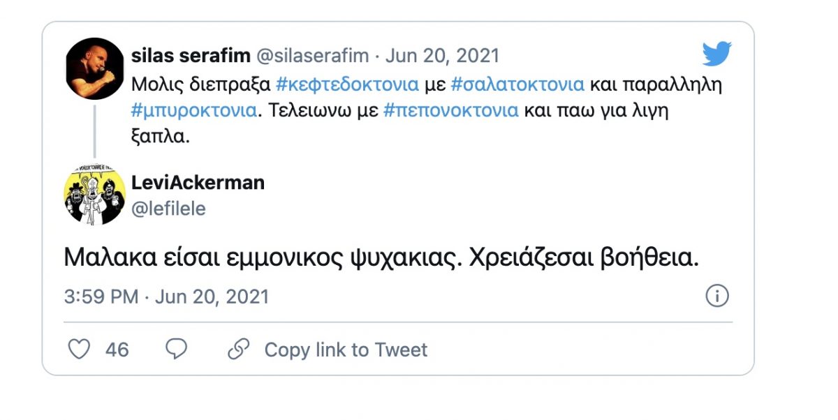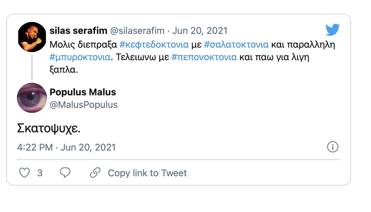 «Μόλις διέπραξα κεφτεδοκτονία με σαλατοκτονία και παράλληλη μπυροκτονία. Τελειώνω με πεπονοκτονία και πάω για λίγη ξάπλα» ήταν το σχόλιο του Σίλα Σεραφείμ.