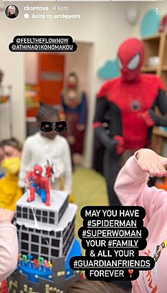 Τεσσάρων ετών γίνεται σήμερα ο γιος της Αθηνάς Οικονομάκου και του Φίλιππου Μιχόπουλου, όμως εκείνοι φρόντισαν να τον γιορτάσουν χθες -Κυριακή γαρ- με ένα απίθανο πάρτι που θέμα του είχε τον Spiderman, αγαπημένο, προφανώς, υπερήρωα του νεαρού.