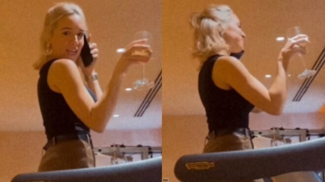 Ειδικότερα, πόσταρε ένα βίντεο όπου εμφανίζεται να κάνει διάδρομο φορώντας τακούνια, ενώ ταυτόχρονα πίνει κρασί και μιλά στο τηλέφωνο.