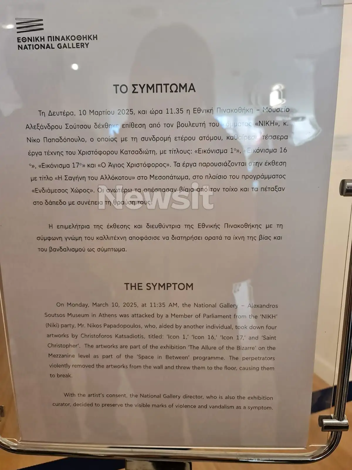 «Τη Δευτέρα 10 Μαρτίου 2025, και ώρα 11;35 η Εθνική Πινακοθήκη – Μουσείο Αλεξάνδρου Σούτσου δέχθηκε επίθεση από τον βουλευτή του κόμματος “Νίκη” κ. Νίκο Παπαδόπουλο, ο οποίος με τη συνδρομή ετέρου ατόμου, καθαίρεσε τέσσερα έργα τέχνης του Χριστόφορου Κατσαδιώτη, με τίτλους “Εικόνισμα 1”, “Εικόνισμα 16”, “Εικόνισμα 17” και ο “Άγιος Χριστόφορος”. Τα έργα παρουσιάζονται στην έκθεση με τίτλο “Η Σαγήνη του Αλλόκοτου” στο Μεσοπάτωμα, στο πλαίσιο του προγράμματος “Ενδιάμεσος Χώρος”. Οι ανωτέρω τα απέσπασαν βίαια από τον τοίχο και τα πέταξαν στο δάπεδο με συνέπεια τη θραύση της», αναφέρεται στην ανακοίνωση που έχει αναρτηθεί στον χώρο της έκθεσης στην Εθνική Πινακοθήκη.