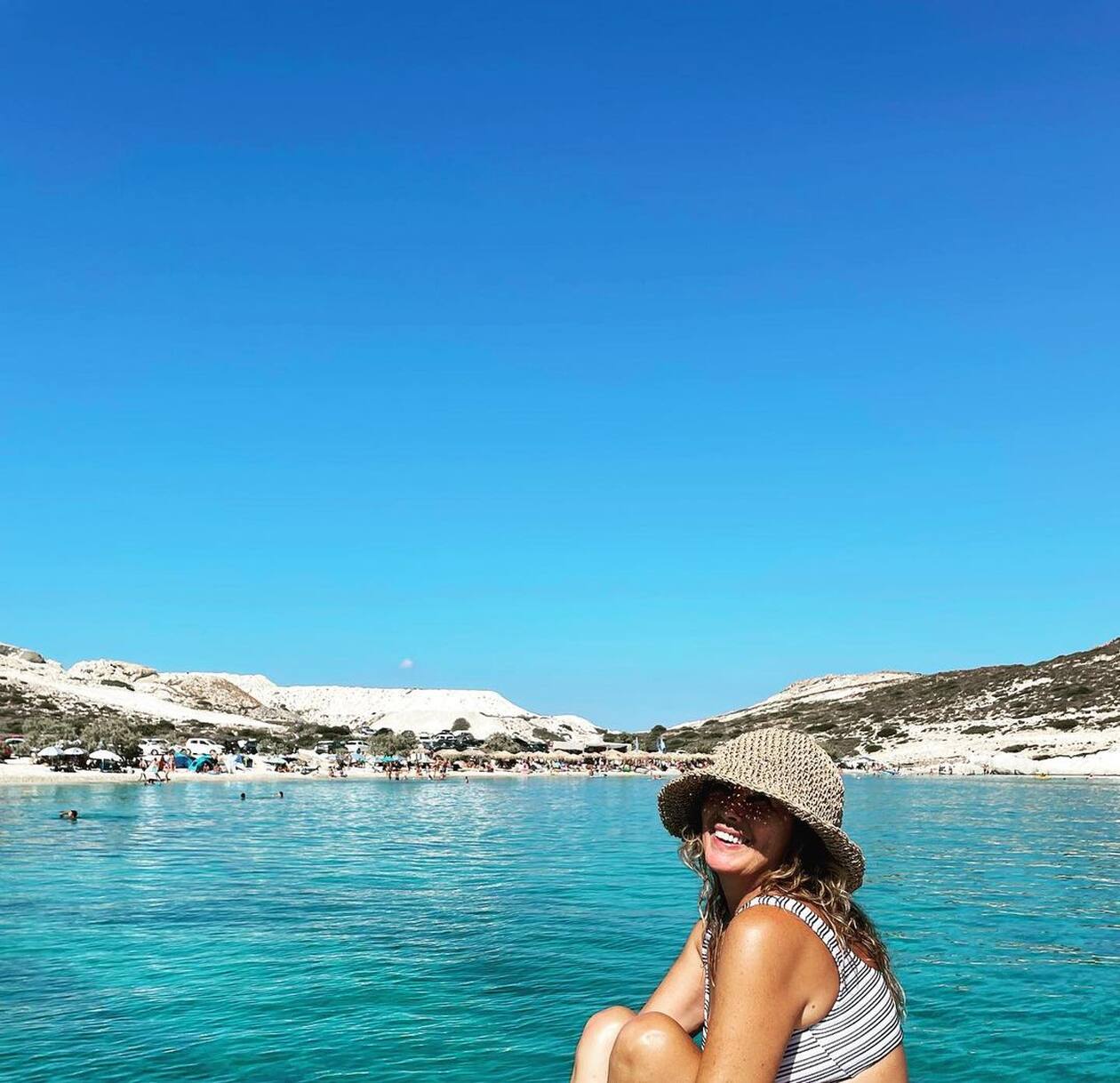 Λίγες ώρες αργότερα δημοσίευσε στο Instagram μία φωτογραφία της με καπέλο και το ίδιο μαγιό με θέα την παραλία Πράσσα της Κιμώλου.