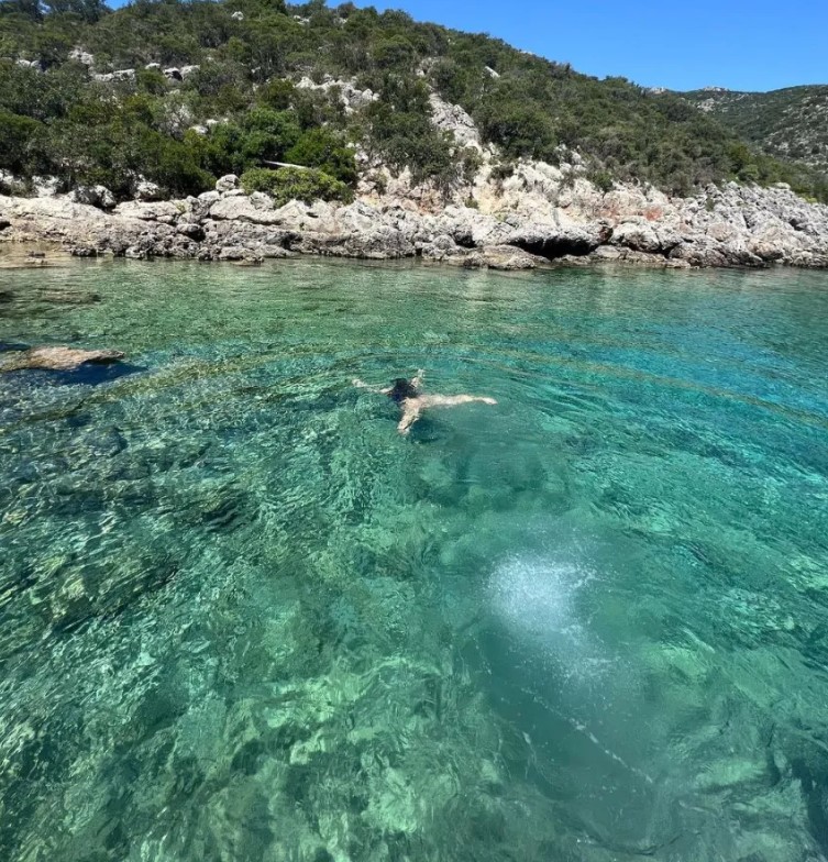 Ειδικότερα, ανάρτησε φωτογραφίες της, στις οποίες η ίδια απολαμβάνει το μπάνιο της στη θάλασσα, φορώντας ένα μωβ ολόσωμο μαγιό.