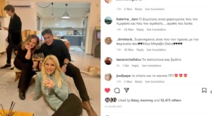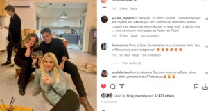 Ντυμένη casual με ένα ζιβάγκο κι ένα μαύρο πανταλόνι απαθανατίστηκε καθισμένη στο χαλί και κρατώντας ένα ποτήρι κρασί στο χέρι της. Στην ίδια φωτογραφία, στο πλευρό της είχε φυσικά τον Δημήτρη Ουγγαρέζο και μια ακόμη συνεργάτιδά της, την Ελένη Γελαλή, ενώ πιο πίσω φαινόταν ο Θοδωρής Κουτσογιαννόπουλος.