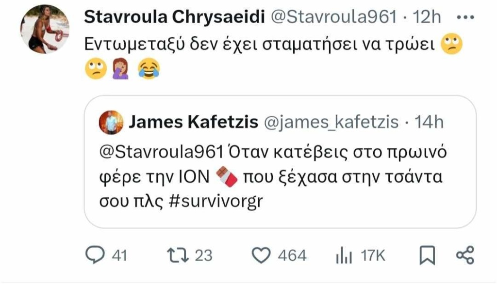 Οι δυο τους δεν έχουν βρεθεί ποτέ ξανά στο παιχνίδι, αλλά φαίνεται να τα πηγαίνουν πολύ καλά. Μάλιστα, ο James «τρόλαρε» την Σταυρούλα στο Twitter του λέγοντάς της να του κατεβάσει στο πρωινό και μια σοκολάτα που είχε ξεχάσει στην τσάντα της, κάτι που εκείνη δεν έκανε κι έτσι εκείνος την απείλησε πως μάλλον θα την ψηφίσει έτσι και χάσουν την ασυλία.