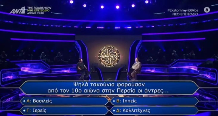 Ο παίκτης Δημήτρης, που συμμετείχε στο επεισόδιο του τηλεπαιχνιδιού «Ποιος θέλει να γίνει Εκατομμυριούχος» στις 18 Οκτωβρίου, βρέθηκε αντιμέτωπος με την τελική ερώτηση για τις 100.000 ευρώ. Η ερώτηση ήταν: «Ψηλά τακούνια φορούσαν από τον 10ο αιώνα στην Περσία οι άντρες…», με τις εξής επιλογές: «Βασιλείς, Ιππείς, Ιερείς, Καλλιτέχνες».