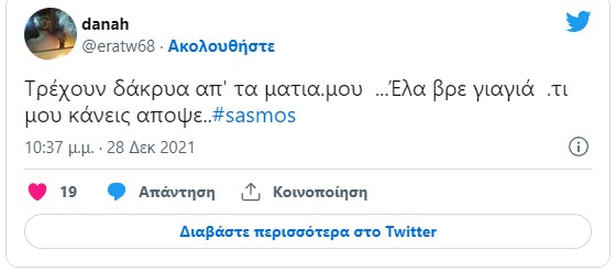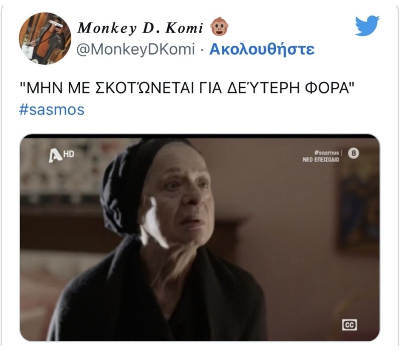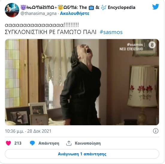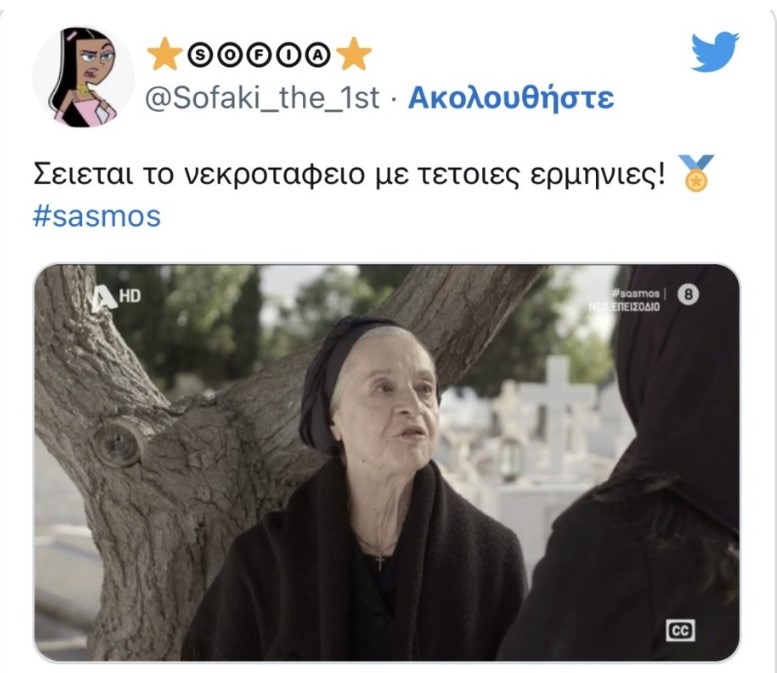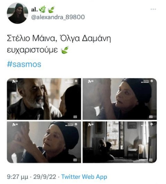 Τη γιαγιά Ρηνιώ υποδύεται στην επιτυχημένη σειρά του Alpha «Σασμός», η Όλγα Δαμάνη, η οποία συγκλονίζει κάθε φορά τους τηλεθεατές με την ερμηνεία της.