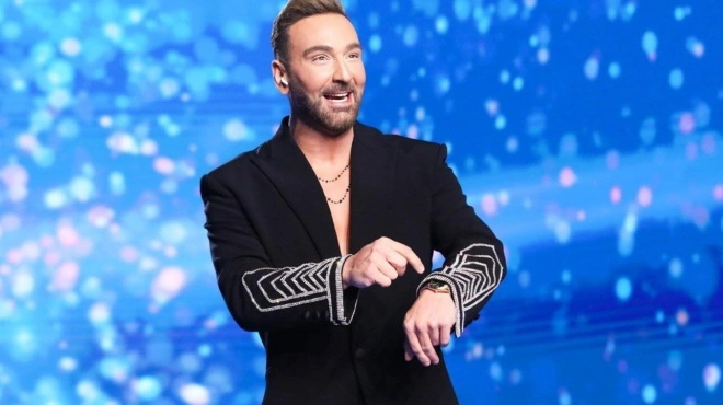 Ειδικότερα, με την βοήθεια των stylists των διασήμων, Χάρη Γκοτζαμανίδη και Ηλία Μιχαλόλια, ο παρουσιαστής φόρεσε ένα blazer με μεταλλικές λεπτομέρειες στους ώμους και τα μανίκια, με «punk διάθεση», το οποίο στο online shop του Givenchy είναι sold out και κοστίζει 4.500 ευρώ.