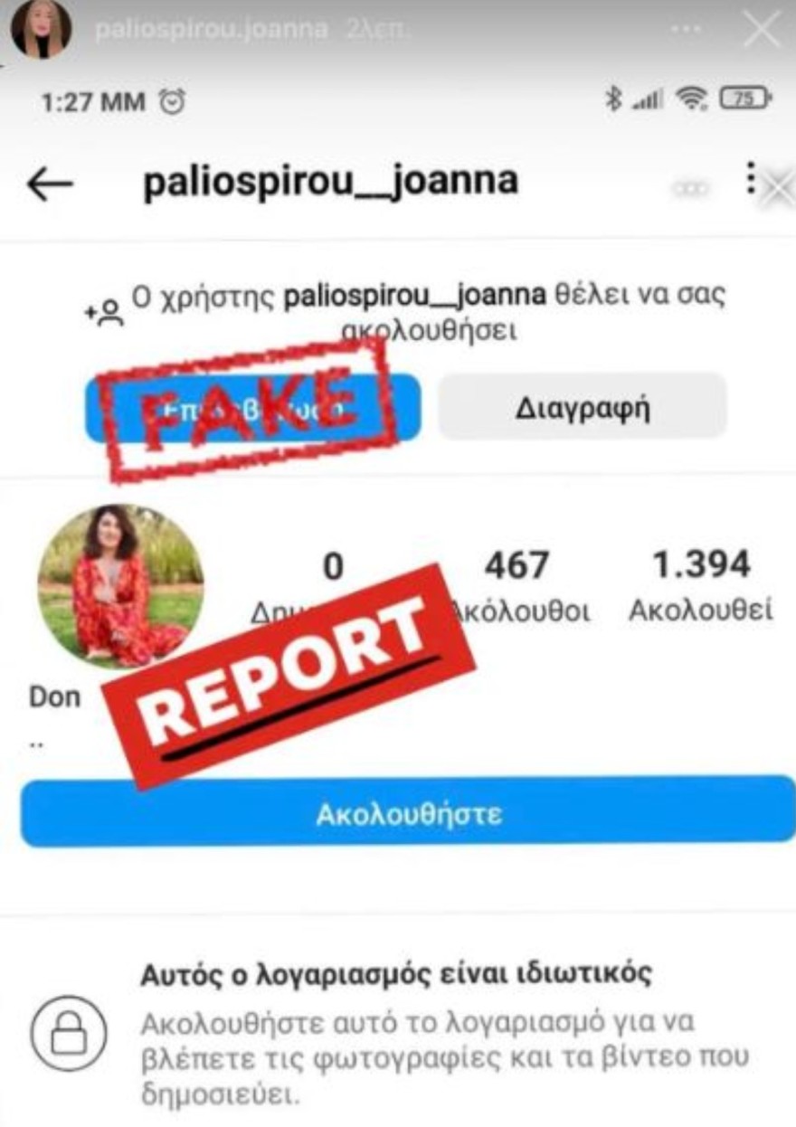 Πιο συγκεκριμένα, η Ιωάννα Παλιοσπύρου ενημέρωσε τους ακόλουθούς της ότι, άγνωστοι δημιούργησαν ένα ψεύτικο λογαριασμό στο Instagram με τα στοιχεία της, χωρίς όμως το προφίλ αυτό να της ανήκει.