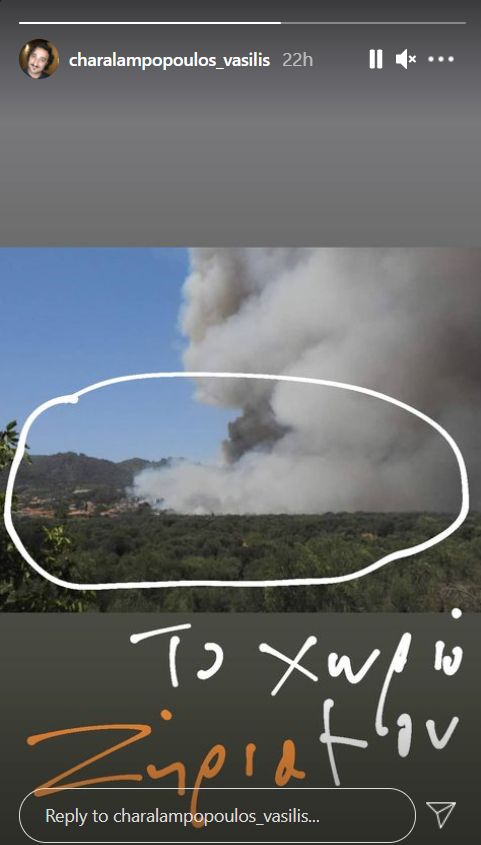 “Η Ζήρια καίγεται μαζί της και τα χρόνια μου τα παιδικά.. Το πατρικό μας αύριο θα δούμε αν σώθηκε… Η παραλία στο Λαμπίρι … τα καλοκαίρια της ζωής μου!!! Τώρα η φωτιά γλύφει τη θάλασσα εκεί που όλα τα δέντρα έσκυβαν πάνω της σα νάθελαν να ξεδιψάσουν… κοίτα να δεις οι στάχτες που βάλθηκαν τις αναμνήσεις να σκεπάσουνε!!! Κουράγιο χωριανοί μου”, έγραψε ο ηθοποιός στο instagram.
