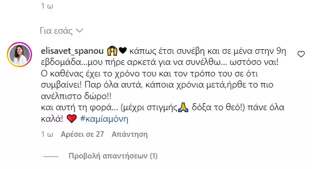 «Κάπως έτσι συνέβη και σε μένα στην 9η εβδομάδα…μου πήρε αρκετά για να συνέλθω… ωστόσο ναι! Ο καθένας έχει το χρόνο του και τον τρόπο του σε ότι συμβαίνει! Παρ όλα αυτά, κάποια χρόνια μετά, ήρθε το πιο ανέλπιστο δώρο!! και αυτή τη φορά… (μέχρι στιγμής δόξα το θεό!) πάνε όλα καλά», έγραψε η Ελισάβετ Σπανού η οποία αυτή την περίοδο διανύει την εγκυμοσύνη της, αφού σε λίγο καιρό θα γίνει μητέρα.