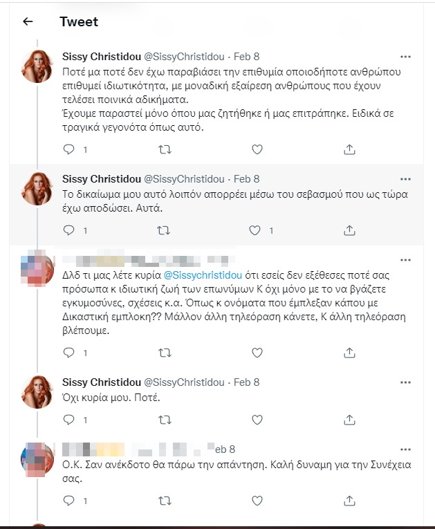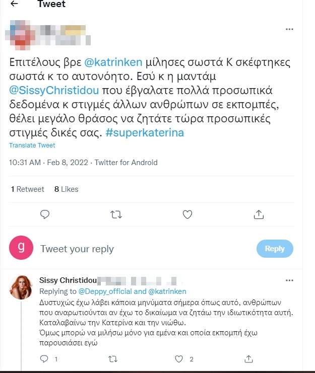 Από τη δική της πλευρά, η Σίσσυ Χρηστίδου θέλησε να πάρει θέση, απαντώντας: «Δυστυχώς έχω λάβει κάποια μηνύματα σήμερα όπως αυτό, ανθρώπων που αναρωτιούνται αν έχω το δικαίωμα να ζητάω την ιδιωτικότητα αυτή. Καταλαβαίνω την Κατερίνα και την νιώθω. Όμως μπορώ να μιλήσω μόνο για εμένα και οποία εκπομπή έχω παρουσιάσει εγώ.
