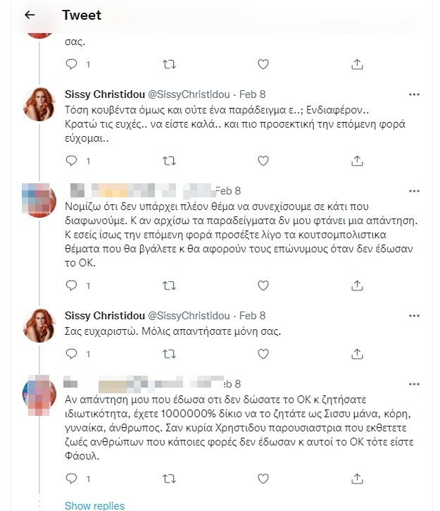 Η αντίδραση της Σίσσυς Χρηστίδου σε σχόλια στο Twitter