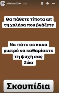 «Θα πάθετε τίποτα απ’ τη χολέρα που βγάζετε. Να πάτε σε κάνα γιατρό να καθαρίσετε την ψυχή σας. Ζώα. Σκουπίδια», είχε γράψει σε insta story η Τζούλια Αλεξανδράτου.