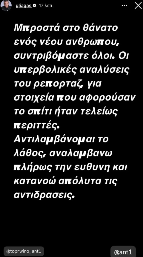 Ο Γιώργος Λιάγκας είχε απαντήσει και με story μέσα από τον λογαριασμό του, την Πέμπτη στο Instagram, γράφοντας: «Μπροστά στο θάνατο ενός νέου ανθρώπου, συντριβόμαστε όλοι. Οι υπερβολικές αναλύσεις του ρεπορτάζ, για στοιχεία που αφορούσαν στο σπίτι ήταν τελείως περιττές. Αντιλαμβάνομαι το λάθος, αναλαμβάνω πλήρως την ευθύνη και κατανοώ απόλυτα τις αντιδράσεις» έγραψε ο παρουσιαστής.