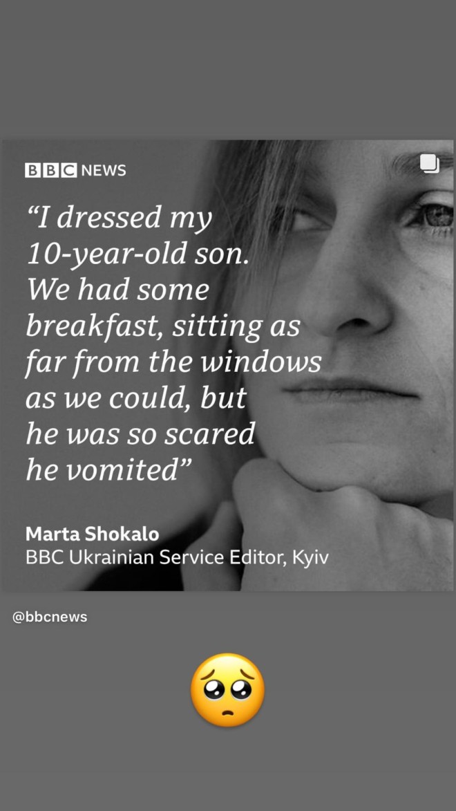 Συγκεκριμένα, η influencer αναδημοσίευσε τα λόγια κάποιας Ουκρανής μητέρας η οποία έλεγε πως έντυσε τον 10χρονο γιο της το πρωί και κάθισαν να φάνε πρωινό όσο πιο μακριά από τα παράθυρα του σπιτιού τους μπορούσαν, όμως εκείνος φοβόταν τόσο που έκανε εμετό.
