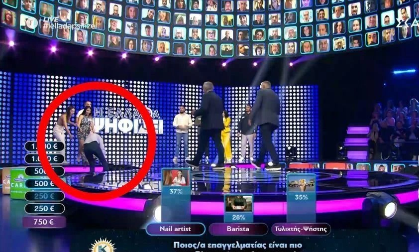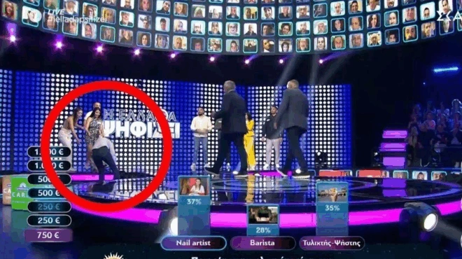 Μία από τις παίκτριες του αποψινού επεισοδίου, η Σταυρούλα, αφού κατάφερε να απαντήσει σωστά σε μία δύσκολη ερώτηση, γύρισε για να βρεθεί κοντά στην ομάδα της, όμως αυτό έγινε με λίγο πιο… κινηματογραφικό βήμα. Εκεί, πάνω στην έξαψη της στιγμής, παραπάτησε και τελικά σωριάστηκε στα σκαλιά του πλατό!