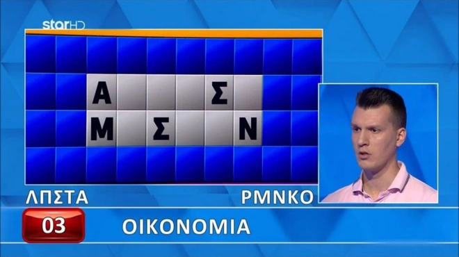 Εκεί συνάντησε έναν γρίφο δύο λέξεων στην κατηγορία «Οικονομία», όπου η ζητούμενη φράση ήταν «Αύξηση Μισθών», με το Α και το Σ να είναι τα μόνα που υπήρχαν φανερά στον πίνακα.