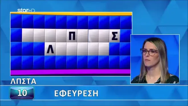 Η κατηγορία ήταν «Εφεύρεση», όπως ανακοίνωσε κι η Νατάσα Κουβελά, με τα γράμματα Λ, Π, Σ, Τ, Α να εμφανίζονται στον πίνακα, ενώ η παίκτρια από την πλευρά της είπε το Κ, το Ν και το Ρ, ενώ για φωνήεν επέλεξε το Ο.