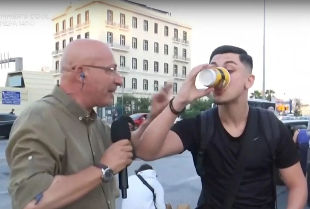 Στη συνέχεια, πλησίασε μια παρέα αγοριών, που είχαν τον ίδιο προορισμό, αλλά πάνω στην ένταση για τις ανάγκες του ρεπορτάζ, έριξε τον καφέ ενός νεαρού, ο οποίος είπε «δεν πειράζει, δεν πειράζει», με τον ρεπόρτερ να φωνάζει «γούρι, γούρι».