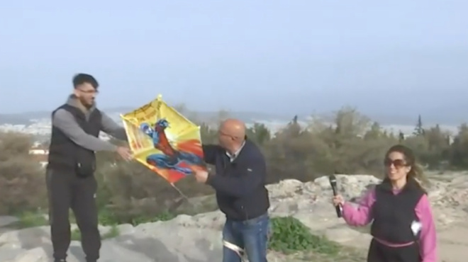Στο σημείο του ρεπορτάζ, στον Λόφο Φιλοπάππου, έχουν μαζευτεί από νωρίς πολίτες, για να πετάξουν τον χαρταετό και ο δημοσιογράφος ζήτησε σε έναν από αυτούς να προσπαθήσει να το κάνει.