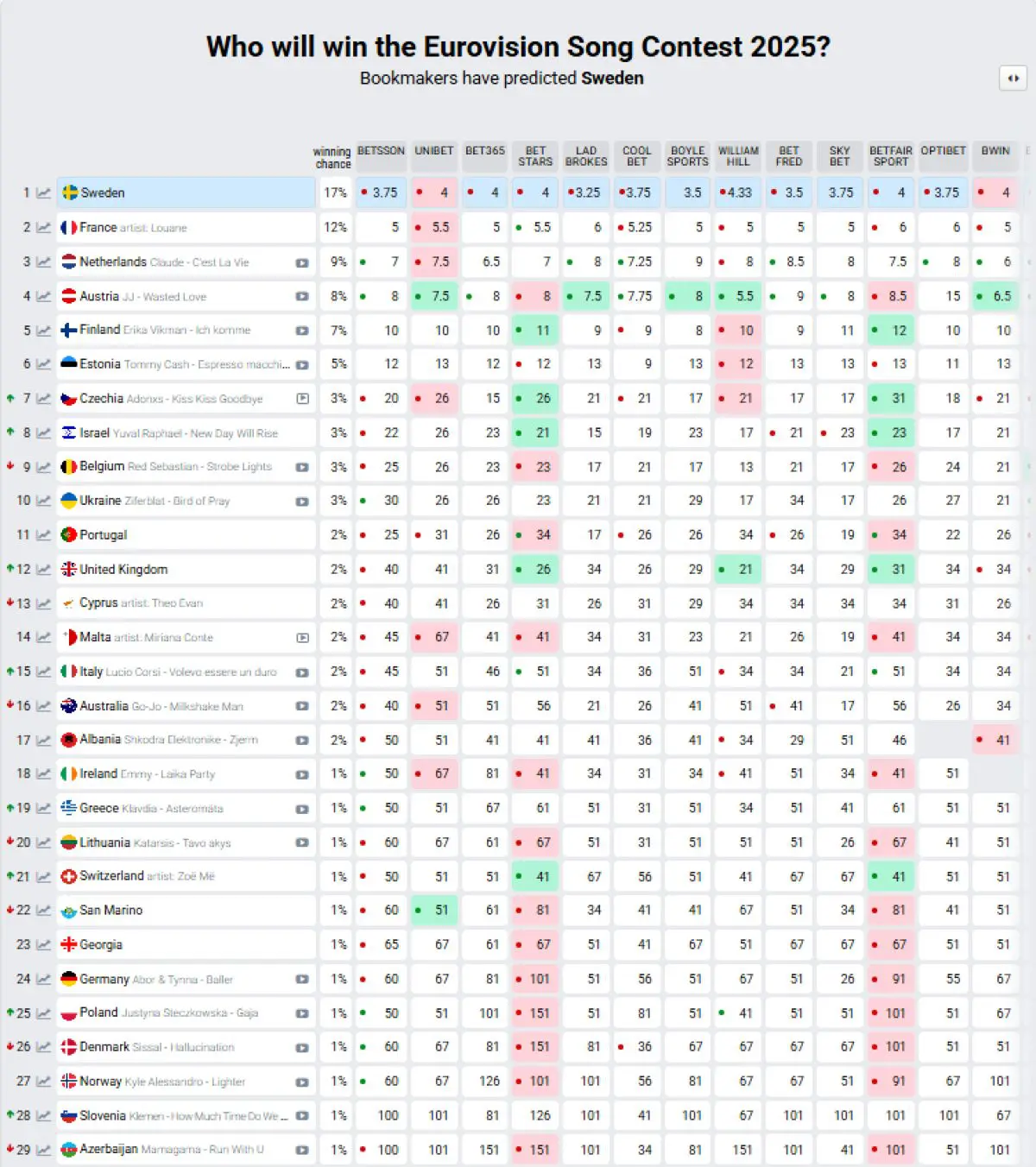 Η Eurovision 2025 πλησιάζει και οι περισσότερες χώρες έχουν πλέον επιλέξει τα τραγούδια που θα τις εκπροσωπήσουν στον διαγωνισμό, ο οποίος θα διεξαχθεί στη Βασιλεία της Ελβετίας, από τις 13 έως τις 17 Μαΐου. Οι στοιχηματικές αποδόσεις διαμορφώνονται συνεχώς, με την Ελλάδα και το τραγούδι «Αστερομάτα» της Klavdia να παραμένουν στη δεύτερη δεκάδα των προγνωστικών.
