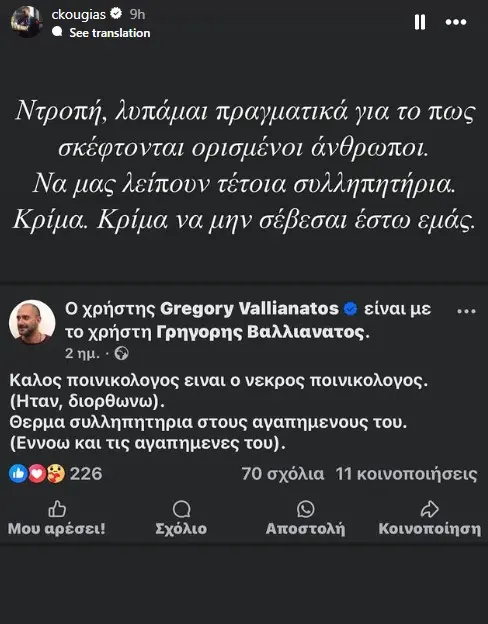 Ο Γρηγόρης Βαλλιανάτος έγραψε το Σάββατο 1 Μαρτίου για τον θάνατο του Αλέξη Κούγια: «Kαλός ποινικολόγος είναι ο νεκρός ποινικολόγος. (Ήταν, διορθώνω). Θερμά συλλυπητήρια στους αγαπημένους του. (Εννοώ και τις αγαπημένες του)».