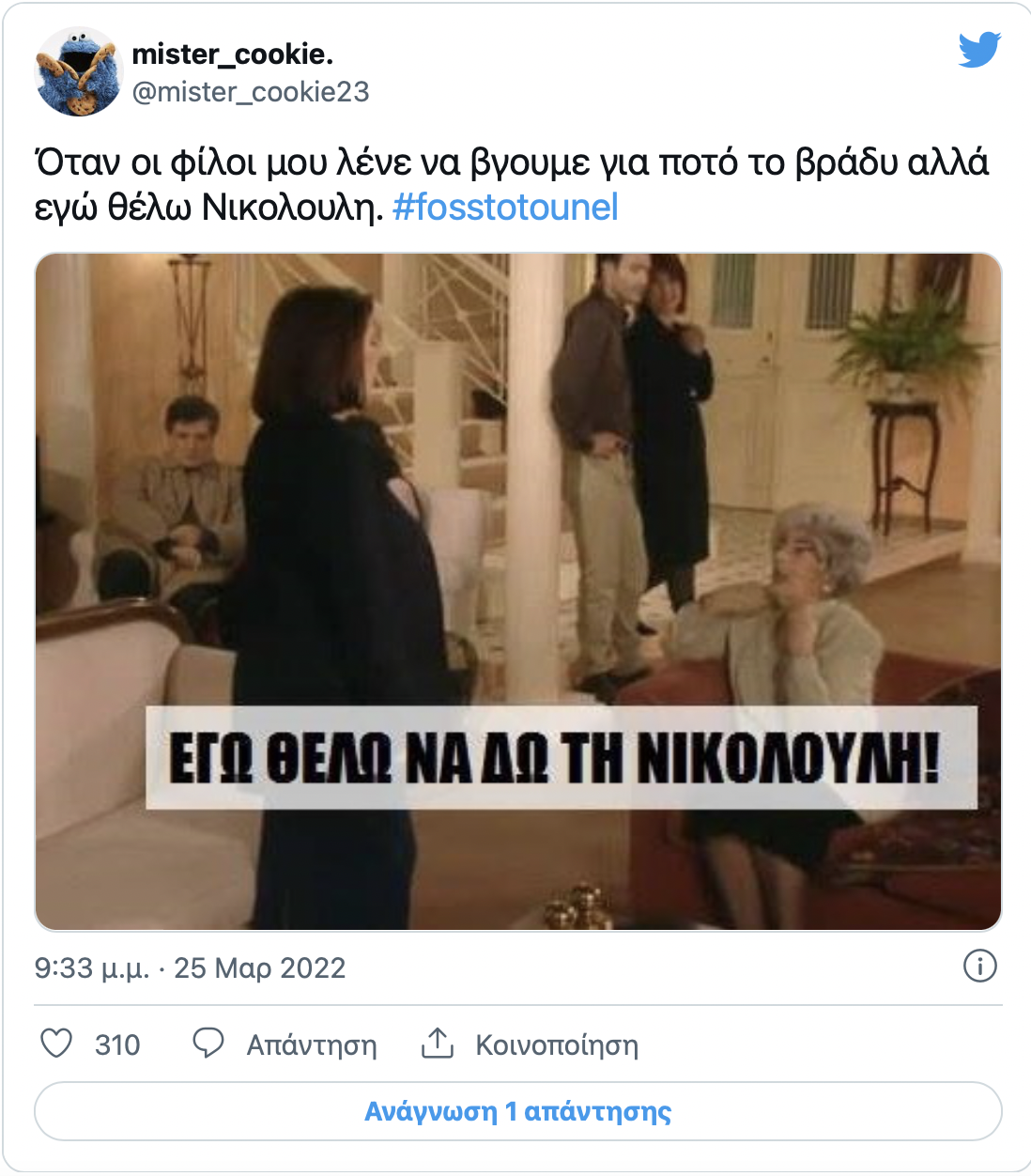 Όταν με ρωτάνε οι φίλοι μου αν θα βγω ενώ έχει Νικολούλη: #fosstotounel #Νικολουλη #Πατρα pic.twitter.com/c176pjVfOQ