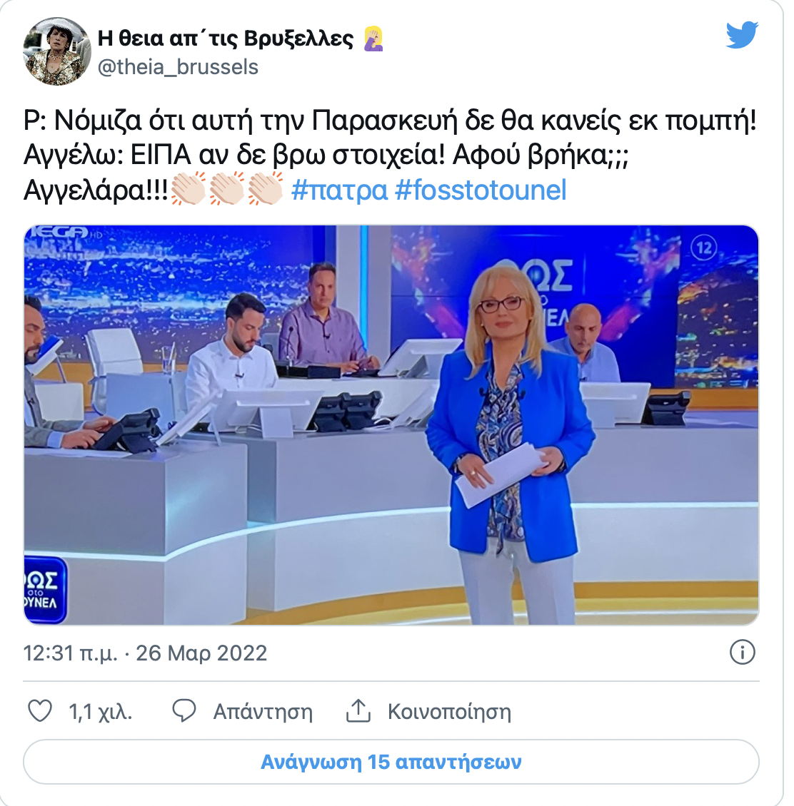 #fosstotounel Σήμερα όλοι καταλάβαμε και επιβεβαιωθήκαμε για ότι λέγαμε τόσο καιρό. Είσαι ότι καλύτερο υπάρχει στην Ελληνική τηλεόραση!!! 🙏🙏❤️❤️#Πατρα pic.twitter.com/GfAt8xmL1i