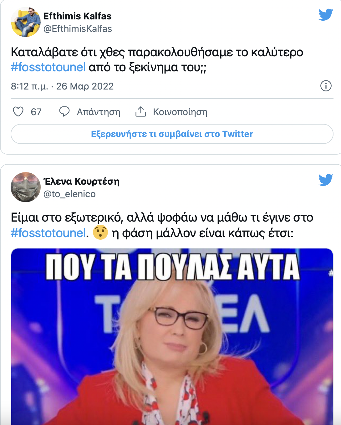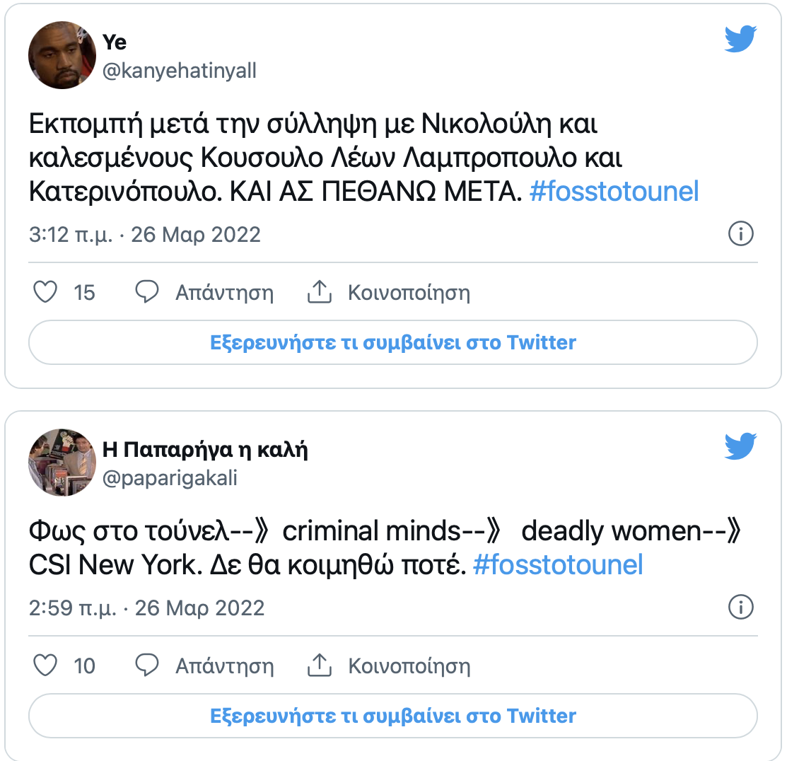 Αξίζει να σημειωθεί πως το #fosstotounel τρεντάρει πρώτο στο Twitter το πρωί του Σαββάτου.