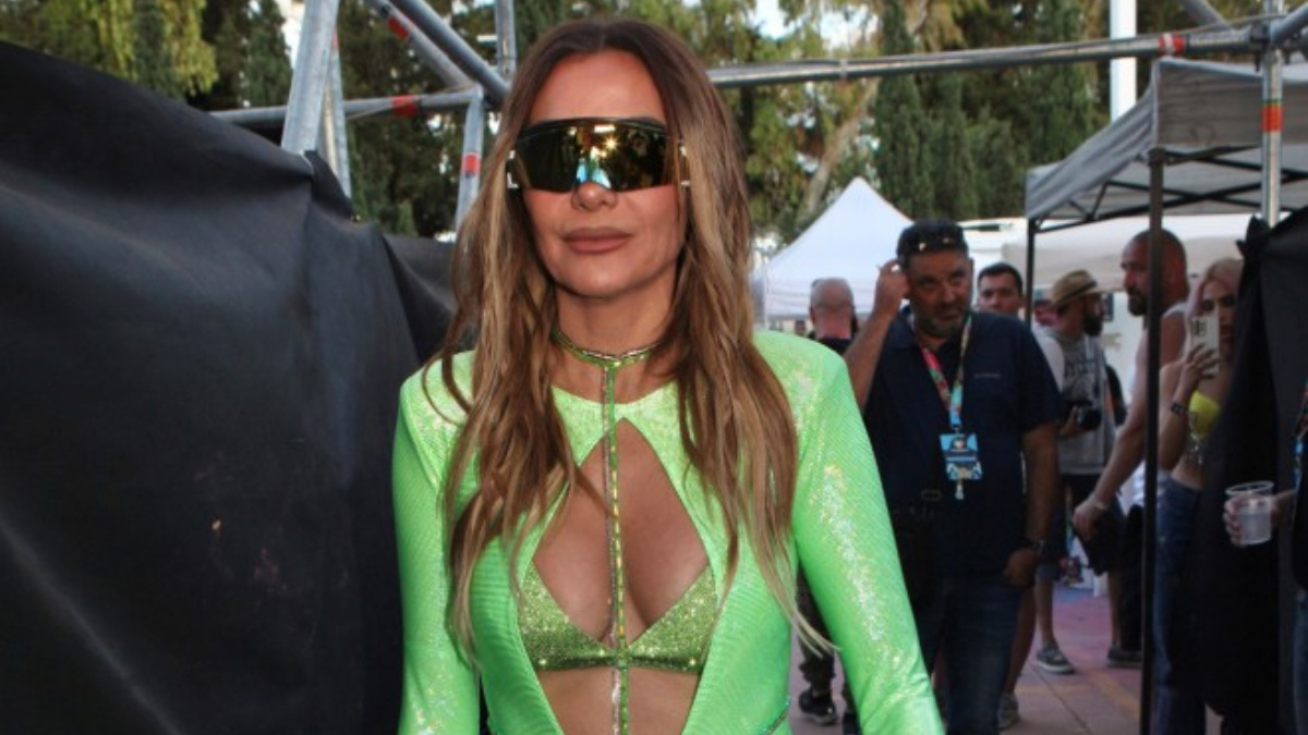 Ειδικότερα, η τραγουδίστρια φόρεσε μια neon ολόσωμη φόρμα, με άνοιγμα στο στήθος και glam bra top στο ίδιο χρώμα, με την υπογραφή της Celia Kritharioti. Την εμφάνισή της ολοκλήρωσε με τεράστια γυαλιά ηλίου και νύχια σε έντονο τιρκουάζ χρώμα.
