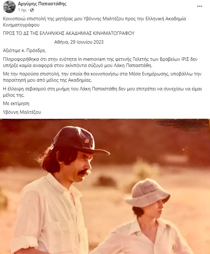 “Κοινοποιώ επιστολή της μητέρας μου Υβόννης Μαλτέζου προς την Ελληνική Ακαδημία Κινηματογράφου