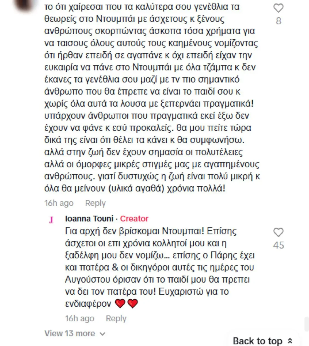 Η Ιωάννα Τούνη δεν άφησε την παρατήρηση αναπάντητη και έσπευσε να διευκρινίσει την πραγματική αιτία της απουσίας του Πάρη. Όπως εξήγησε, «Για αρχή δεν βρίσκομαι Ντουμπάι! Επίσης άσχετοι οι επί χρόνια κολλητοί μου και η ξαδέλφη μου δεν νομίζω… Επίσης ο Πάρης έχει και πατέρα & οι δικηγόροι αυτές τις ημέρες του Αυγούστου όρισαν ότι το παιδί μου θα πρέπει να δει τον πατέρα του! Ευχαριστώ για το ενδιαφέρον».